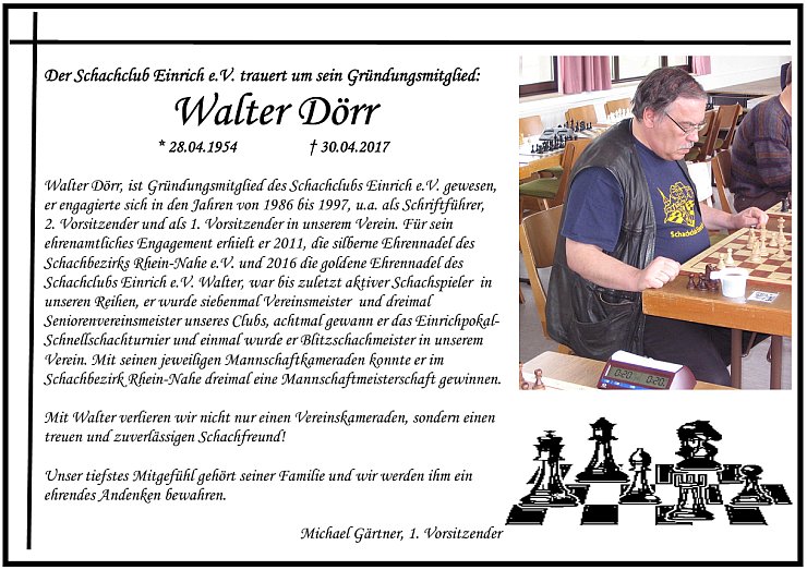 Unser Vereinsschachfreund Hans Wilhelm Kries ist am Samstag, 16. Mai 2020 verstorben. Hans Wilhelm Kries, geboren am 28.12.1956 wurde nur 63 Jahre alt.  |