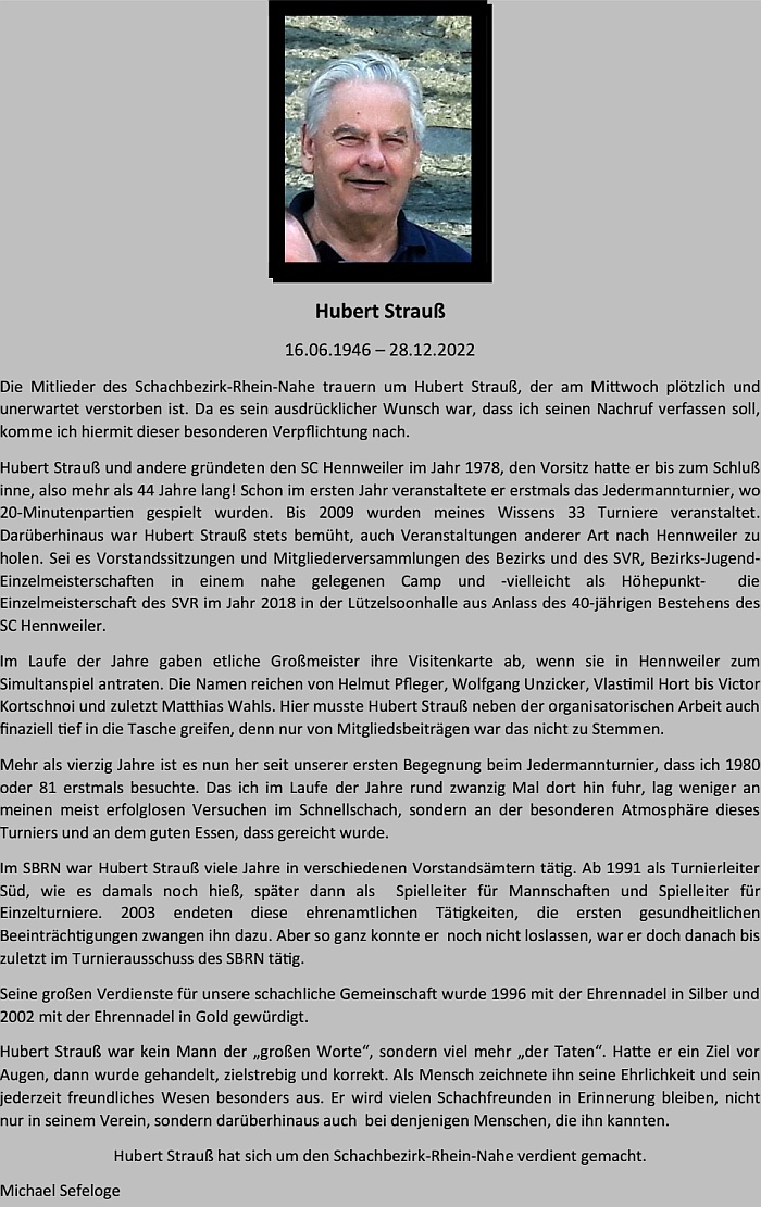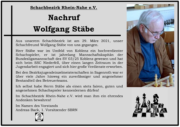 Der Schachbezirk Rhein-Nahe dankt Helmut Vogel für sein fast 70 Jahre währendes Interesse an unserem Sport und wird ihn in bleibender Erinnerung behalten.